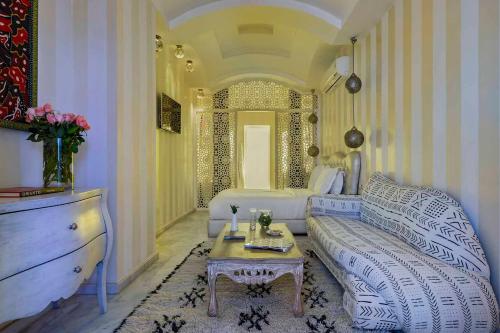 The Suite Deluxe is located on the riad’s first floor. This suite has two large arches that give lighting to the room and a view of the patio above. The bathroom has a marble finish, a large tub, and a double shower.